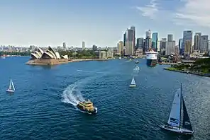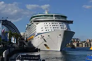 The PCT Steering Committee also highlighted that between 2002-2008, cruise ship berthing had grown at an annual rate of 18%, culminating in an estimated 250,000 passengers entering from the OPT. This, it was identified, resulted both from an increasing growth in the cruise ship industry as well as the increasing passenger capacity of vessels.[18] The Ports Authority of New South Wales (formerly, Sydney Ports Authority) has also highlighted the importance changes necessary in the wake of rapid growth in the cruise ship industry and noted that passenger ships arriving in Sydney had nearly tripled from 119 in 2009/10 to 280 in 2014/15.[19] The opening of the White Bay Cruise Terminal in Balmain East in August 2013, has helped to alleviate some of the congestion experienced by the Overseas Passenger Terminal. Despite this, the OPT remains to be the only commercial berth on the seaward (East) side of the Sydney Harbour Bridge, and continues to pose future operational challenges as its passenger handling capacity is due to be reached in 2016.[18]