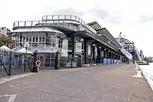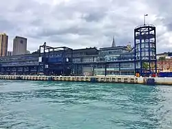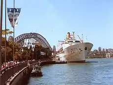 The Overseas Passenger Terminal (OPT), known officially as the Sydney Cove Passenger Terminal,[1] is a public passenger terminal servicing cruise ships and ocean liners located in Circular Quay, Sydney, Australia. Whilst commercial shipping operations on and around the site date from 1792, the current primary structure and waterfront promenade date from 1958, with subsequent on-going alterations and land reclamation throughout the latter part of the 20th century. The current design retains the black steel portal frame trusses of the original 1958 structure, with major additions completed in 1988 in the Post-War International Style through the collaboration of Sydney architects Lawrence Nield and Peter Tonkin.