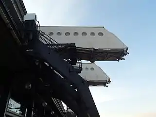 The Overseas Passenger Terminal's two extendible gangways, designed specifically for the building are listed as items of state heritage significance in New South Wales, independently of the main terminal structure. These structures are unique and were specifically designed for use at the OPT. In its original state, there were five of these extendible gangways attached to the terminal.[32] During the 1988 refurbishment two of these extendible gangways were removed and relocated to the Wharf 13 at Pyrmont and Wharf 10 at Darling Harbour.[2]