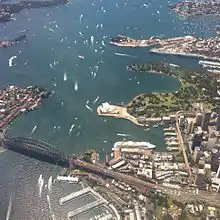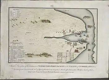 The site of the OPT is located within the country of the Cadigal (Gadigal), a part of the wider Eora Aboriginal peoples within the Sydney Region and one of the several hundred communities of Indigenous Australian peoples.[6] It has been noted that the Cadigal people were a harbour-dwelling clan, inhabiting the various shorelines which stretched from inner South Head, through the present Eastern Suburbs to Warrane (or War-ran, now known as Sydney Cove) and from the City of Sydney to west of Gomora (now known as Darling Harbour).[6][7][8] The current site of the Overseas Passenger Terminal was part of the Sydney Cove area (now Circular Quay) and, following the arrival the First Fleet on 26 January 1788 under the direction of Arthur Philip, first Governor of the Penal Colony of New South Wales, Sydney Cove was chosen as the site of the new settlement.[7]