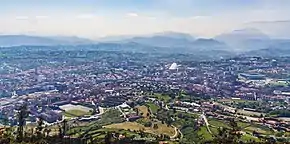 Oviedo (UK: /ˌɒviˈeɪdoʊ/, US: /ˌoʊvi-, oʊˈvjeɪdoʊ, -ˈvjɛ-, -ðoʊ/,[2][3][4] Spanish: [oˈβjeðo]; Asturian: Uviéu [uˈβjeʊ]) is the capital city of the Principality of Asturias in northern Spain and the administrative and commercial centre of the region. It is also the name of the municipality that contains the city. Oviedo is located approximately 24 km (15 mi) southwest of Gijón[5] and 23 km (14 mi) south of Avilés,[6] both of which lie on the shoreline of the Bay of Biscay. Oviedo's proximity to the ocean of less than 30 kilometres (19 mi) in combination with its elevated position with areas of the city more than 300 metres above sea level causes the city to have a maritime climate, in spite of its not being located on the shoreline itself.
