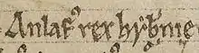 The name of Amlaíb mac Gofraid as it appears on folio 7v of British Library Cotton Faustina B IX: "Anlafus rex Hẏberniæ".[117]