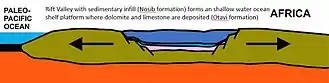 The breakup of Rodinia (Late Precambrian) is the origin of the original depositional series of the Owambo Basin. The rifting apart of the Congo Craton from the Rodinean shallow sea created a classic pull-apart basin. Pull-apart basins are characterized by faults that create an area of crustal extension, causing uplift at the edges and a sinking of the center, which is infilled by sediment or, in this case, a shallow sea (See Image 3).[4] The deposition of the Nosib Formation (900-750 Ma) is the original deposition from the mass wasting of the newly uplifted edges of the Congo Craton, followed by the Otavi Formation (750-650 Ma), composed of dolomite and limestone from the formation of the shallow sea.[1]