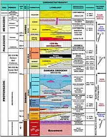 ![]() Stratigraphic cross-section of the Owambo Basin with the Damara Sequence highlighted in red, modified from Komona et al. | |