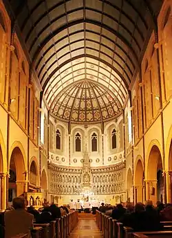 The church was designed by Joseph Hansom in a Gothic Revival style.[5] Much of the original interior decoration was painted over in the 1970s, and the altar moved forward. The building is being gradually restored as part of the "Oxford Oratory - Reaffirmation & Renewal" campaign.