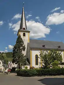 The likelihood is high that a parish had been established at Pünderich beginning in 1515. Confirming this is the church's building date, which can be reliably reckoned to be 1529. This church had a length of 59 Schuh (roughly 18.5 m) and a breadth of 43 Schuh (roughly 13.5 m). In 1766, a new church building was built on the old square by the master builder of the Springiersbach church, Paul Staehling, for 2,400 Reichsthaler; in the same year a sacristy was built onto it for 140 Reichsthaler. Only nine years later, however, the church was falling into disrepair, and building director Johann Seiz was commissioned to examine the building. He suggested replacing the vaulting, which he found to be too flat and too weak, with a wooden ceiling and improvements to the roof frame. These things were done by the following year, and the churchtower was also built higher. The church that stands today is from 1766, as shown on the lintel above the lefthand entrance door. The church's dimensions are some 25 ×11 m. The three-sided quire faces the east. The original entrance with formerly purely Gothic jambs is now glazed to make room for a spiral stairway up to the gallery. Today, entry is through two side doors in the porch.