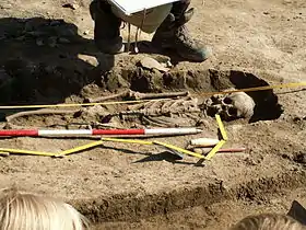 The Předmostí site appears to have been a living area with associated burial ground with some 20 burials, including 15 complete human interments, and portions of five others, representing either disturbed or secondary burials. Cannibalism has been suggested to explain the apparent subsequent disturbance,[2] though it is not widely accepted. The non-human fossils are mostly mammoth. Many of the bones are heavily charred, indicating they were cooked. Other remains include fox, reindeer, ice-age horse, wolf, bear, wolverine, and hare. Remains of three dogs were also found, one of which had a mammoth bone in its mouth.