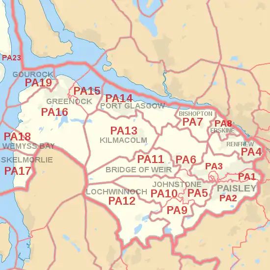 The PA postcode area, also known as the Paisley postcode area,[2] is a group of 67 postcode districts in western Scotland, within 35 post towns. These cover Renfrewshire (including Paisley, Renfrew, Johnstone, Bishopton, Erskine, Bridge of Weir and Lochwinnoch), Inverclyde (including Greenock, Port Glasgow, Gourock, Kilmacolm and Wemyss Bay) and most of Argyll and Bute (including Oban, Lochgilphead, Tarbert, Campbeltown, Appin, Taynuilt, Bridge of Orchy, Dalmally, Inveraray, Cairndow, Colintraive, Dunoon, Tighnabruaich, and the Isles of Mull, Iona, Coll, Tiree, Jura, Colonsay, Islay, Gigha and Bute), plus small parts of North Ayrshire (including Skelmorlie) and Highland.