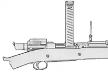 During World War I, the United States secretly developed the Pedersen device attachment for the M1903 Springfield rifle that allowed it to fire a .30 caliber (7.62 mm) pistol-type cartridge in semi-automatic mode.[4][5] This attachment was developed to allow an infantryman to convert "his rifle to a form of submachine gun or automatic rifle" in approximately 15 seconds.[5][4]