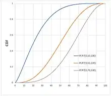 | Cumulative distribution function  Example cumulative distribution curves for the PERT probability distribution | |||