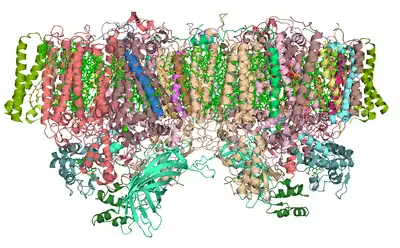 Photosystem II (of cyanobacteria and green plants) is composed of around 20 subunits (depending on the organism) as well as other accessory, light-harvesting proteins.  Each photosystem II contains at least 99 cofactors: 35 chlorophyll a, 12 beta-carotene, two pheophytin, two plastoquinone, two heme, one bicarbonate, 20 lipids, the Mn