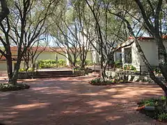 Padua Hills was a 2,000-acre tract of land directed by Bess Garner and Herman Garner. It was subdivided into a 6-acre artist colony called the Little Theater Association with a central dining room, artist studio, shops, and a small theatre. Located three miles north of Foothill Boulevard in the City of Claremont, the Spanish Revival buildings were nestled at the base of the mountains and surrounded by lush trees and shrubs. As described by the National Register of Historic Places, "The complex is situated on six acres of land and includes three buildings--a theater and restaurant building, an adjacent apartment, and a studio/residence--grouped around a central courtyard. The landscaping of olive trees and rock walls and curbing, along with an outdoor stage structure are contributing site features. A 'Padua Hills Theatre' sign with a pair of Mexican folk dancers and a life-sized statue of an Indian maiden add to the mood of the setting."[3] The theatre was operated by the Padua Institute, a non-profit educational corporation. Offering courses in Mexican folk music, dance, and Spanish, the institute was advertised for its work in preserving the Spanish and Mexican heritage of early California.[4]