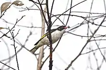 Using environmental cues, the timing of nesting is determined by the painted honeyeaters so that they are not arriving at sites as food resources are declining rather than beginning to increase.[20] Coinciding breeding with fruit ripening may also correlate with the preference of many individuals to nest near or amongst mistletoe.[20] It constructs a shallow, flimsy-looking, cup-shaped nest of fine grass and rootlets, bound with spider webs, hanging by the rim from twigs in the outer foliage of a shrub or tree, 3–20 m above the ground.[21][22]