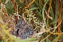 Height of nests in trees can vary from a couple of metres off the ground to over 15 metres high.[18] They are usually built in the drooping foliage of a eucalypt or other suitable tree species, or they are made within the structure of a mistletoe plant.[18]