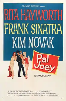 Pal Joey is a 1957 American musical comedy film directed by George Sidney, loosely adapted from the Rodgers and Hart musical play of the same name, and starring Rita Hayworth, Frank Sinatra, and Kim Novak. Jo Ann Greer sang for Hayworth, as she had done previously in Affair in Trinidad (1952) and Miss Sadie Thompson (1953). Novak's singing voice was dubbed by Trudy Stevens.[2] The choreography was managed by Hermes Pan. Nelson Riddle handled the musical arrangements for the Rodgers and Hart standards "The Lady Is a Tramp", "I Didn't Know What Time It Was", "I Could Write a Book", and "There's a Small Hotel".