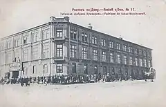 The three-story building in Rostov-on-Don at the corner of present-day Budennovsky Avenue and Pushkinskaya Street was built in the 1880s for the needs of Kushnaryov Tobacco Factory. In 1914 the "Ya. S. Kushnaryov Partnership" together with Aslanidi Tobacco Factory joins merged with Asmolov Tobacco Factory Enterprise, and so the building on Budennovsky Avenue was rebuilt in 1914-1915 in the Empire architectural style on the project of the Armenian architect Arutyun Khristoforovich Zakiev.[1]