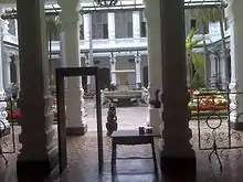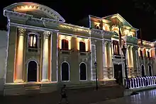 Today's building is the result of the work undertaken by the Venezuelan architect Alejandro Chataing in 1906. It is located on the corner of Gradillas a Monjas opposite the Plaza Bolívar, and occupies half of the plaza's southern section.[8] It is built in an eclectic Neoclassical style with three storeys along the main façade. The main entrance is flanked by double pillars in the composite order. It is crowned by a balcony decorated with composite pilasters and a triangular frontispiece. The east façade is also decorated with composite pillars designed to resemble those of the Roman Forum or similar works from antiquity.[9] The large colonial building has an elegant patio in the interior and also houses the museum.[5]