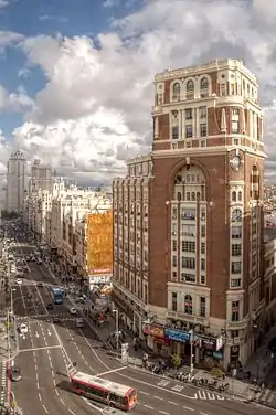 Commissioned by the Madrid Press Association (APM) to serve as corporative headquarters,[1] the building's project was authored by Pedro Muguruza. The first sketches date from 1924.[2] It was intended to provide a mixed use, including apartments for rent, offices, a movie theatre (ultimately located in the northern end of the plot) and a concert hall.[3] The three different volumes the building features convey this circumstance. The 16-floor southern tower rises to a height of 58 metres.[1]