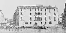 The original palace was built in the 14th century. It was redesigned in Venetian Gothic style for the Pisani family in 1475. In 1525, it became the private residence of Doge Andrea Gritti.[1] The second facade on the Campo was designed in the 16th century. The canal facade once had frescoes, now lost, by Giorgione. An additional story was added in the late 19th century.
