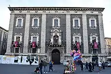 In 1572, archbishop of Catania, Antonio Faraone, founded a formal seminary, which by 1614 was located in a building here, facing the Senatorial building located where the present Palazzo degli Elefanti rises.[2] The building was incorporated into the Porta Uzeda, which was an opening in the Walls of Charles V. The building was partially damaged during the 29 May 1647 revolt against Spanish authorities.[3]