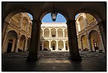 The piazza in front, once called piazza della fiera del lunedì, ultimately acquired its present name of piazza dell’Università.[2] Behind the prominently arcaded facade, in the piano nobile, is a large hall (aula magna) frescoed by Giovanni Battista Piparo. The center of the palace has a large courtyard,[3] decorated with an elaborate pavement design using black and white stone. The architect Vaccarini had used similar projects in the Collegio, now Convitto Cutelli, and the Collegio dei Gesuiti (adjacent to St Francis Borgia church).[4]