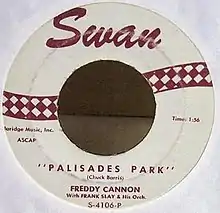 Released by Swan Records as a B-side to "June, July and August," "Palisades Park" broke in when a Flint, Michigan radio DJ played it by mistake. It peaked at #3 on the Billboard Hot 100 on 23–30 June 1962,[3] On the Hot R&B Sides chart, the song went to #15.[4] "Palisades Park" was the biggest hit of Cannon's career.[5]