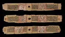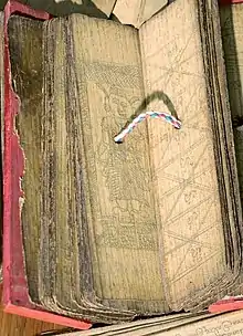 Palm-leaf manuscripts are manuscripts made out of dried palm leaves. Palm leaves were used as writing materials in Indian subcontinent and in Southeast Asia reportedly dating back to the 5th century BCE.[1] Their use began in South Asia and spread to other regions, as texts on dried and smoke-treated palm leaves of Palmyra palm or the talipot palm.[2] Their use continued till the 19th century, when printing presses replaced hand-written manuscripts.[2]