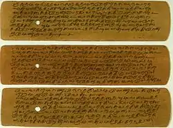 The text in palm leaf manuscripts was inscribed with a knife pen on rectangular cut and cured palm leaf sheets; colourings were then applied to the surface and wiped off, leaving the ink in the incised grooves. Each sheet typically had a hole through which a string could pass, and with these the sheets were tied together with a string to bind like a book. A palm leaf text thus created would typically last between a few decades and about 600 years before it decayed due to dampness, insect activity, mold and fragility. Thus the document had to be copied onto new sets of dried palm leaves.[2] The oldest surviving palm leaf Indian manuscripts have been found in colder, drier climates such as in parts of Nepal, Tibet and central Asia, the source of 1st-millennium CE manuscripts.[6]