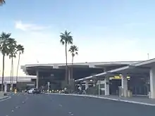 PSP's passenger terminal consists of three parts—the main building, the elevated Sonny Bono Concourse to the north, and a yet-unnamed concourse to the south. The airport has 19 total gates.[13] Airside, it has a unique open-air layout in that all passenger walkways connecting these structures are roofless.[14]