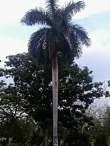 Like all monocots, palms do not have the ability to increase the width of a stem (secondary growth) via the same kind of vascular cambium found in non-monocot woody plants.[12] This explains the cylindrical shape of the trunk (almost constant diameter) that is often seen in palms, unlike in ring-forming trees. However, many palms, like some other monocots, do have secondary growth, although because it does not arise from a single vascular cambium producing xylem inwards and phloem outwards, it is often called "anomalous secondary growth".[13]