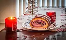 Pan de jamón (ham bread) is a typical Venezuelan Christmas bread, filled with ham, raisins and green olives.[1] Many variations have been created, some filling the bread with other ingredients like turkey or cream cheese and others using puff pastry as the dough. Pan de jamón appeared in the beginning of the 20th century and slowly became a tradition in the Christmas season in Venezuela and Madeira.