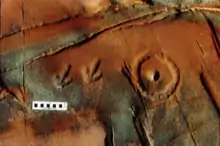 The Panaramitee Style has been argued to be over seven thousand years old based on archaeological dating techniques, anthropological research, the recent occurrence of geographic barriers and animal tracks which possibly portray extinct megafauna.[2] Rock art is notoriously difficult to accurately date with very few examples of stratigraphic association which are conclusively related to the artwork (Mulvaney and Kamminga 1999:367). However, it has been long assumed that the Panaramitee Style is very old based on Basedow's aforementioned early publication. He justified a Pleistocene age by using four main arguments (1) petroglyphs located at two sites are inaccessible because of vertical erosion (2) detached painted rock on the valley floor, the other part of the design situated high on the rock face (3) dark patina covering the petroglyphs (4) speculated megafauna tracks, said to reflect extinct diprotodon prints.[5] This was furthered by later claims from Norman Tindale suggesting genyornis and procoptodon tracks near Yunta Springs and reports from Charles P. Mountford that a saltwater crocodile was depicted at Panaramitee station.[5] Since the extinction of most megafauna transpired at least 20,000 years ago and the extinction of saltwater crocodiles in this region millions of years ago, these speculations would suggest a very late antiquity.[1]