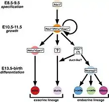 Pancreatic progenitor cells have been shown to arise from cells originating from the developing foregut during mammalian development.[4][5] It has been seen in the developing embryo at stages E9.0 to E9.5 that there are a cluster of cells which give rise to the pancreas. These clusters have been characterized to show multipotent properties.[6]