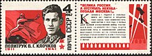 Commissar Vasily Klochkov: "Russia is a vast land, yet there is nowhere to retreat – Moscow is behind us!" on the Soviet postage stamp (1967)