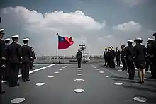 The three cadets had boarded the ship on 21 February, and the fleet left Zuoying Naval Base on 5 March 2020 for a goodwill visit with Palau.[7][9][6] The fleet stayed at Palau from 12 March to 15 March 2020, although the size restrictions at the port in Palau meant that only Kang Ding entered the port.[9] After departing Palau, the fleet remained at sea for roughly a month before returning to Zuoying Naval Base on 15 April.[lower-alpha 2][6][9]