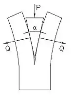 The wedge interposes the compression-resistant properties of its solid-state structure to change the direction and strength of a vector force transmitted by it. In the figure, the axeman imparts a momentum to the blade which, impacting the wood, generates a force acting at P along the length of the blade. The force does not leave in that direction because there is no bearing surface there. Instead, the force departs at right angles to the bearing surfaces at Q, forcing the wood apart and imparting momentum to any chips that fly off.