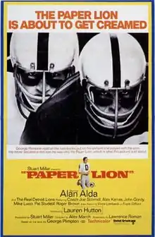 Paper Lion is a 1968 sports comedy film starring Alan Alda as writer George Plimpton, based on Plimpton's 1966 nonfiction book of the same name depicting his tryout with the Detroit Lions of the National Football League. The film premiered in Detroit on October 2, 1968, and was released nationwide the week of October 14, 1968.[2]