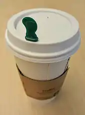 Hot drinks sold in paper cups may come with a plastic lid, to keep the drink hot and prevent spillage. These lids have a hole through which the drink can be sipped. The plastic lids can have many features including peel back tabs, raised walls to protect the foam of gourmet hot drinks and embossed text.[30] In 2008, Starbucks introduced shaped plastic "splash sticks" to block the hole, in some of their stores, after customer complaints about hot coffee splashing through it.[31][32]