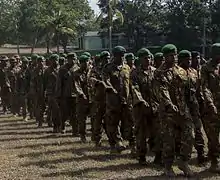 The PNGDF originated from the Australian Army land forces of the Territory of Papua New Guinea before independence, coming into being in January 1973 and having its antecedents in the Pacific Islands Regiment. At independence it numbered 3,750 all ranks, while another 465 Australian personnel augmented the force to assist in training and technical support.[10] In the mid 1990s, the PNG economy was in crisis with financial support provided by the World Bank and the International Monetary Fund (IMF) on the proviso of economic reform with the first phase in 1996 to include defence. Successive attempts to reduce the size of the PNGDF in response to the country's economic problems provoked fierce resistance. In 2000, the World Bank and the IMF provided loans with economic reform conditions and a Commonwealth Eminent Persons Group (CEPG) report recommended to government that the PNGDF strength be reduced by more than half. In March 2001, soldiers mutinied after learning the government had approved the CEPG report.[11] The government capitulated after 10 days to the mutineers' demands, agreeing not to cut the army's strength. However, in 2002 it was announced that the PNGDF would be reduced from 4,000 to around 2,100 personnel. In early 2004 the government reaffirmed its commitment to implement cuts within the armed forces, with a definitive restructuring expected to take place. Chief of Staff Captain Aloysius Tom Ur told troops in January 2004 that the 2004 strength of 3,000 would be reduced by one-third, and that during 2004, the force's personnel branch would merge with the support branch into a new organisation.[12] Ultimately the reduction-in-size target was reached in 2009.[7]