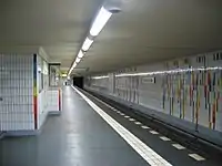 The station was designed by Alfred Grenander and was originally sandy-coloured.[13] Around 1992, it was retiled in small white tiles with multicoloured accents representing the colours of all the Berlin U-Bahn lines, making it one of the most colourful stations in the system.[2]
