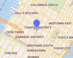 The surrounding area is part of Manhattan's Theater District and contains many Broadway theatres.[1] 1501 Broadway shares the block with 229 West 43rd Street, the Hayes Theater, and the St. James Theatre to the west. Other nearby buildings include the Majestic Theatre, the Broadhurst Theatre, and the Shubert Theatre to the northwest; One Astor Plaza to the north; 1530 Broadway to the northeast; 1500 Broadway to the east; 4 Times Square and One Times Square to the southeast; 3 Times Square to the south; the American Airlines Theatre, Lyric Theatre, and New Victory Theater to the southwest.[2]