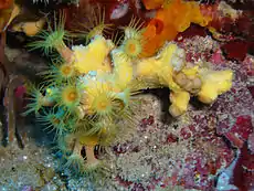 Parazoanthus axinellae, commonly known as the yellow cluster anemone, is a zoanthid coral found on the southern Atlantic coasts of Europe and in the Mediterranean Sea. Zoanthids differ from true sea anemones, in having a different internal anatomy and in forming true colonies in which the individual animals (polyps) are connected by a common tissue, called the coenenchyme.