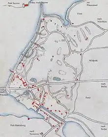 In 1682 Frederick William of Brandenburg, the Great Elector, commissioned the first hunting lodge Jagdschloss Glienicke next to the uninhabited village Klein-Glienicke which suffered badly in the Thirty Years' War. The lodge had a garden with four carp ponds. South of the lodge was an enclosed wildlife park; north a tree garden and two vineyards.[2] Already since 1660 the first wooden Glienicke Bridge linked the area to Potsdam. In 1715 under Frederick William, the Soldier King, the lodge became a military hospital for soldiers to be quarantined. In 1747 the hospital head Dr. Mirow bought the tree garden and the new vineyard which were neglected since the Soldier King's death and established there an estate where besides farming kilns for bricks and lime were operated. In 1758 the lodge itself was turned into a wallpaper factory which became an orphanage in 1827. From 1789 on the Berlin-Potsdam chaussee (de) was built distinctly separating former lodge and new estate. The Mirow estate had different owners until the Prussian lieutenant general and head equerry Count Carl von Lindenau (de) bought it in 1796[3]: 378 and converted it into an ornamented farm.[4]/: 22-