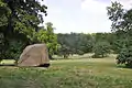 Touring Park Glienicke by coach was done on the Drive, the main park road, which began at the Middle Gate, nowadays an inconspicuous flight of stairs at the Berlin-Potsdam chaussee(Königstraße). When the chaussee was expanded to become Reichsstraße 1 the street level was raised at the park. Middle Gate was not anymore at the level of the Big Meadows requiring a flight of stairs. To access the “Volkspark” a monumental limestone flight of stairs was probably built in 1935 which was replaced by a more modest construction after 1945.[5]: 170 In the 19th century visitors drove through Middle Gate, then past the big erratic with the date 1 May 1824(date of purchase of estate by Prince Charles) and along Big Meadows where the Palace Pond and the Workers’ Quarters were on sight to finally reach the open part of the Garden Courtyard where they entered the Palace. From the Palace the Drive, allowing a view of Coach House Courtyard, went north along Shore Ridge with the Tent as highest vantage point. Close to Hunter's Court after a rather sharp bend the park road went south to the Big Meadows during the first years. Only at the end of the 1830s the completion of the three “gorges” with the pertinent bridges on Shore Ridge and buildings like the Court Gardener's House with the adjacent water tower of the pumping station increased significantly the number of sights inside the park along the sightlines from the Drive. With the park extensions after 1840 the Drive was also extended to include the new parts in the north and the east. Several times the curve in the north was redesigned to a larger radius enabling a new route in the north which offered e.g. a splendid view of Peacock Island from the Drive. In its design the main park road became more dramatic in the east. From a dam leading southeastward views were possible into “gorges” adorned with erratics. Passing the Hermitage the Drive descended into the wooded parts from where in a big westward curve it ascended to the edge of a steep slope which was impressive regarding the usual regional topography. From vantage points there magnificent long-distance views on the Potsdam cultural ensemble were possible. At the Upper Gate the Berlin-Potsdam chaussee was crossed and the tour continued into Böttcherberg-Park. Following another steep ascent the Alexandra Bench offered a view into the gorge there. At the Rondell the tour would usually be continued to the adjacent Babelsberg Park. On a shorter tour the coach would drive from the Rondell via the Middle Gate back to the Palace.