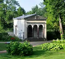 The Stibadium was designed by Friedrich Ludwig Persius and built on the site of a neoclassical greenhouse with a garden room(built after 1796) in 1840.[15]: 63 The semi-circular Tholos structure with a wooden half-cone roof was the main place for having tea. On the underside of the roof a twelve deities programme is painted. As there are 14 fields the Twelve Olympians were supplemented with Bacchus and Amphitrite. The middle pillar had originally a zinc-cast Kore designed by August Kiss which later was replaced with a marble copy of the Felicitas Publica in the monument Max-Joseph Denkmal by Christian Daniel Rauch in Munich.[16] On the terrace stands a granite bowl by Christian Gottlieb Cantian which Charles inherited after his father died in 1840. The Stibadium had the function to be a shield between pleasure ground and Drive. It had also the opposite purpose of the Curiosity pavilion. While looking on the common people from such an elevated and prestigious building the Prince's tea party was on show to the people at the same time. The paintings of the Twelve Olympians may seem presumptuous, yet they are an artistic expression of how Prussian aristocrats saw themselves in the age of European Restoration.