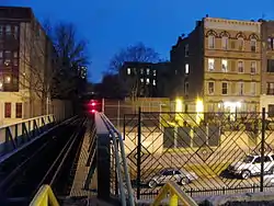 During 1905–1906, this portion of the line was rebuilt as a raised elevated railway and embankment structure,[4] and a new station was built at this location, with a single floor-level island platform and a station house between the tracks. The new station was located with the station house over Park Place and the platform extending north from that point.