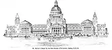 In 1935 a proposal was made to demolish the old Parliament House, alongside the Sydney Hospital and the Sydney Mint, to be replaced by a new parliament House facing Bridge Street, as well as a Law Courts complex facing Martin Place.[15] The plan was however postponed due to expenses related to the Great Depression in 1936.[16]