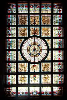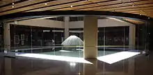 At the opposite end of the entrance building is the Legislative Council chamber. Here, the colour scheme is red, representing the House of Lords. This chamber contains a vice-regal chair, for use by the Monarch in Australia or her representative, the governor, and the chair of the president of the council. Both chairs are made from red cedar, the vice-regal chair in 1856 and the president's chair in 1886. The table in front of the chairs was also made in 1856 from red cedar. The wall behind the two chairs is covered by bookshelves holding the Hansard records. The chamber is also decorated with seven busts, four depicting early presidents of the council in ceremonial dress and three of other prominent former members in Roman togas. As in the lower house, government members sit on the president's right and opposition members on the left.[4] Behind the entrance building is the Jubilee Room, used for committee meetings and public functions. In this area, which is open to the public, there is also the Fountain Court, an exhibition venue containing a fountain by Robert Woodward. Beneath the Fountain Court is a 166-seat theatrette and above it a roof garden sometimes used for functions. Together with a small post office, these 1970s features form a "square doughnut"-shaped building linking the streetfront buildings with a 12-storey block at the rear. This block, with views over the Domain contains offices for members and other staff and meetings rooms, as well as dining facilities, a fitness area and car parking and service areas. The building has a power co-generation unit that serves Sydney Hospital and the State Library of New South Wales as well as Parliament House.[5]