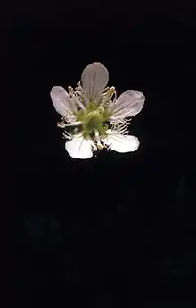 The single flower has five small jagged sepals behind five veined, fringed white petals each roughly a centimeter long. At the center of the flower are five stamens and five staminodes with edges of many narrow, round-tipped lobes.