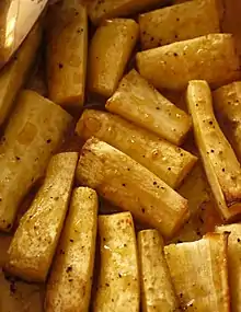 Parsnips resemble carrots and can be used in similar ways, but they have a sweeter taste, especially when cooked.[15] They can be baked, boiled, pureed, roasted, fried, grilled, or steamed. When used in stews, soups, and casseroles, they give a rich flavour.[8] In some cases, parsnips are boiled and the solid portions are removed from the soup or stew, leaving behind a more subtle flavour than the whole root, and starch to thicken the dish. Roast parsnip is considered an essential part of Christmas dinner in some parts of the English-speaking world and frequently features in the traditional Sunday roast.[16] Parsnips can also be fried or thinly sliced and made into crisps. They can be made into a wine with a taste similar to Madeira.[17]